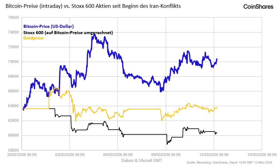 Vor diesem Hintergrund – steigendes Inflationsrisiko, gedrückte Zinssenkungserwartungen, schwächeres Wachstum – hätte man einen Verkaufsdruck auf Bitcoin erwarten können. Dies ist nicht geschehen. Seit Beginn der Krise ist Bitcoin um etwa 6 bis 6,5 % gestiegen, während Gold um 1 bis 1,5 % zugelegt und Aktien gefallen sind. Diese Divergenz ist aus unserer Sicht analytisch signifikant.