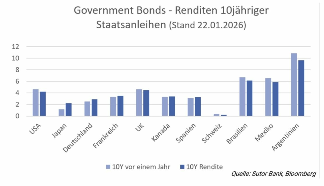 Dieses Muster zeigt sich auch außerhalb Europas. Weltweit haben die Renditen langfristiger Staatsanleihen zugelegt, teils sehr deutlich. Besonders ausgeprägt ist die Entwicklung in Japan. Dort stiegen die Renditen zehnjähriger Staatsanleihen von 1,192 Prozent vor einem Jahr auf aktuell 2,239 Prozent, was einem Zuwachs von fast 88 Prozent entspricht.