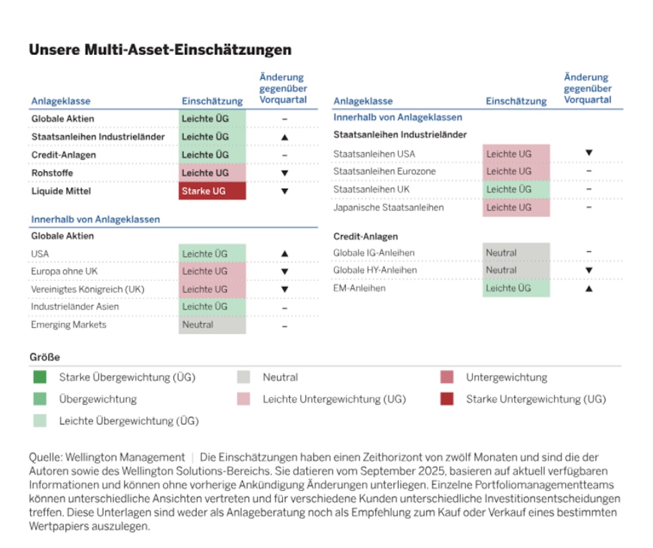 Wir befürworten nach wie vor eine leichte Übergewichtung globaler Aktien. Die Gewinne entwickeln sich weltweit solide, und die politischen Rahmenbedingungen sind günstig. Obwohl noch Fragen zu den US-Zöllen offen sind, scheint ein Großteil der Unsicherheit inzwischen hinter uns zu liegen. Wir stehen KI weiterhin positiv gegenüber. Die massiven Investitionen sorgen kurzfristig für einen konjunkturellen Aufschwung und könnten langfristig zu noch bedeutenderen Produktivitätssteigerungen führen.