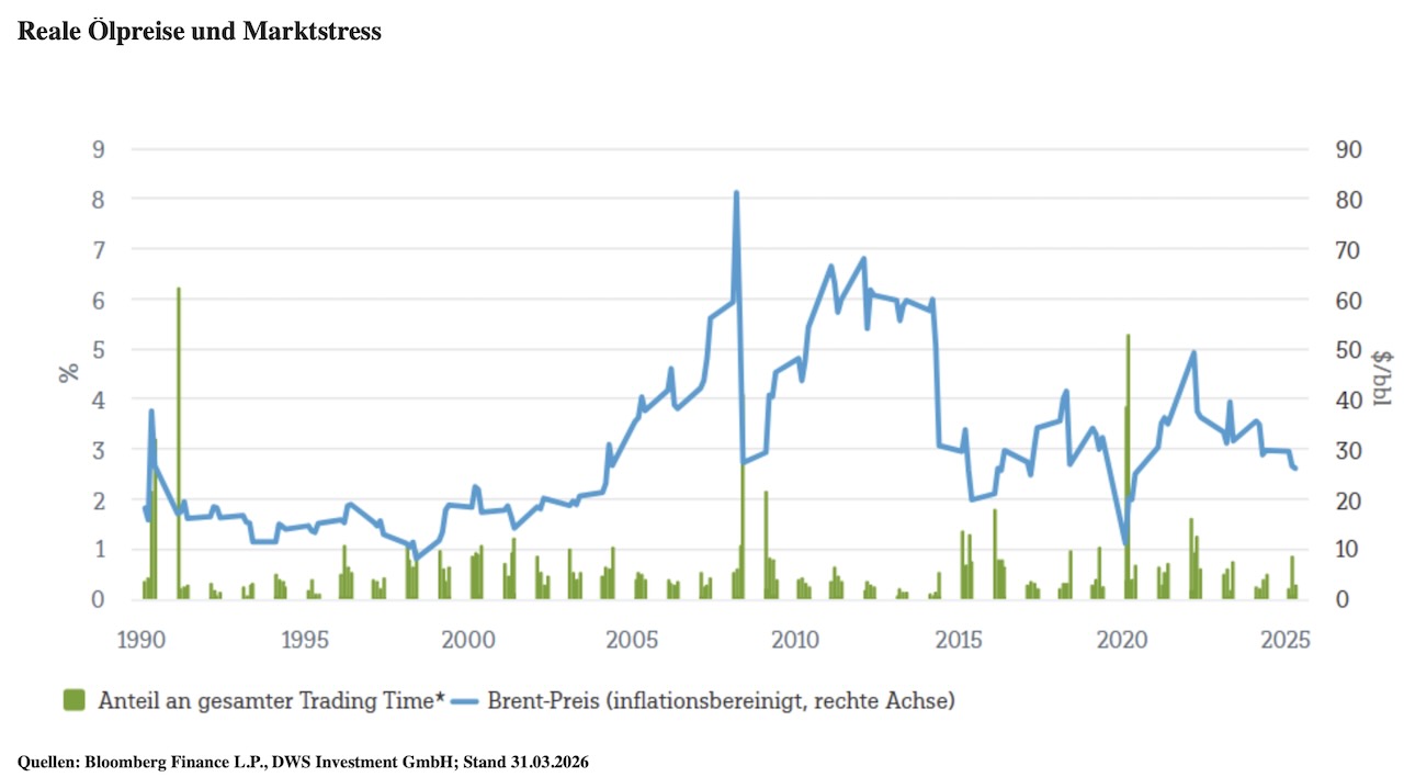 „All das zeigt, dass es sinnvoll ist, über die Schlagzeilen hinauszublicken“, argumentiert Darwei Kung, Head of Investment Strategy Liquid Real Assets bei der DWS. „Die ‚Trading Time‘ zeigt, dass der Gesamtstress zwar unter früheren Extremwerten bleibt, aber vor allem in kurzen, heftigen Phasen auftritt. Beim Öl kann selbst moderate Turbulenz – wenn sie sich auf wenige Wochen verdichtet – Verhalten und Nachfrage unverhältnismäßig stark beeinflussen.“ Wenige turbulente Wochen können die Wirkung von Jahren entfalten. Und wenn das geschieht, ist das dauerhafte Ergebnis nicht zwingend ein anhaltend höherer Preis, sondern eine geringere Nachfrage nach Öl. Oder, wie Lenin es vielleicht formuliert hätte: Ölpreisschocks sind Nachfragedestruktion plus Elektrifizierung.