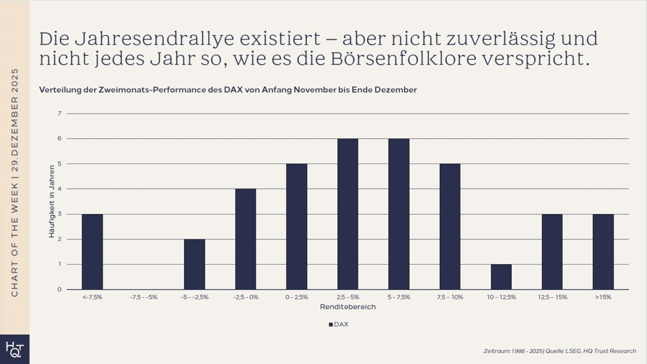 Ein Blick auf fast vier Jahrzehnte DAX-Geschichte zeigt: Die Rallye ist weder Mythos noch verlässliche Gesetzmäßigkeit – sondern vor allem eine Frage von Definitionen und Gefühlen.