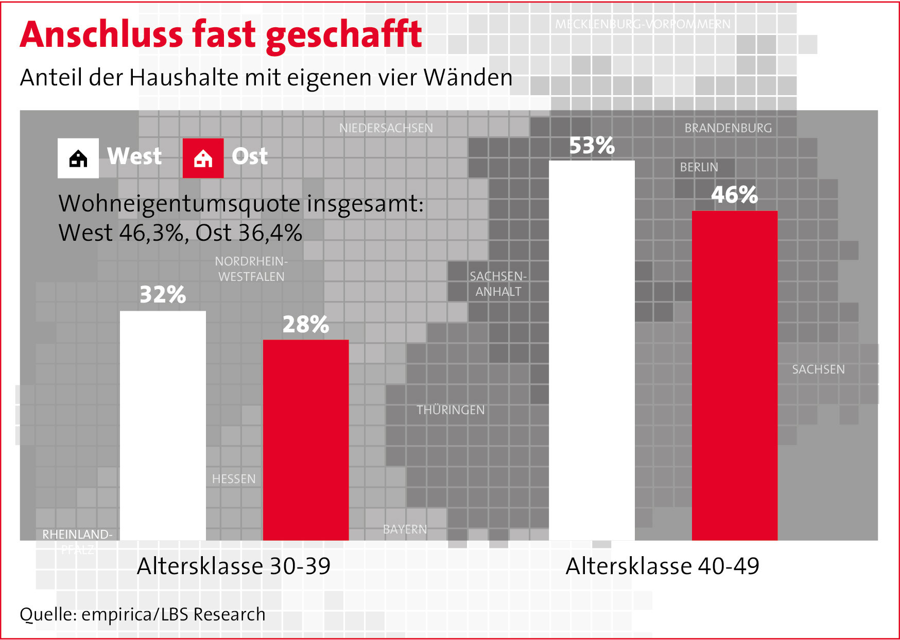 Die amtlich ausgewiesene niedrige Wohneigentumsquote für die neuen Länder verschleiere damit die tatsächlich stattfindende Annäherung, so die Analyse. Dies wird laut LBS Research auch noch eine Reihe von Jahren so bleiben. Besonders bei den Haushalten über 60 Jahren wirke die systematische Benachteiligung von privaten Wohneigentümern zu DDR-Zeiten immer noch nach.