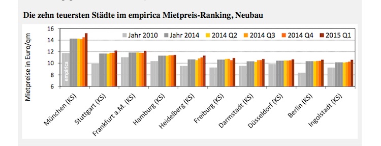 In München waren die Mietpreise im ersten Quartal 2015 mit rund 15 Euro pro Quadratmeter deutschlandweit am höchsten. Es folgten Stuttgart und Frankfurt mit rund zwölf Euro pro Quadratmeter. In Hamburg, Heidelberg und Freiburg verlangten Vermieter rund elf Euro pro Quadratmeter. Wohnungen in Darmstadt, Düsseldorf, Berlin und Ingolstadt schlugen mit zehn bis elf Euro pro Quadratmeter zu Buche. (st)