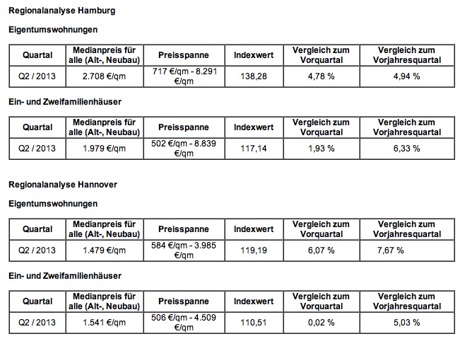 Im zweiten Quartal 2013 weisen nach Aussage von Dr. Klein sowohl die westdeutschen Metropolen Hamburg und Hannover als auch die ostdeutschen Städte Berlin und Dresden anziehende Preise auf dem Wohnungs- und Hausmarkt auf und erreichen neue Höchstwerte.