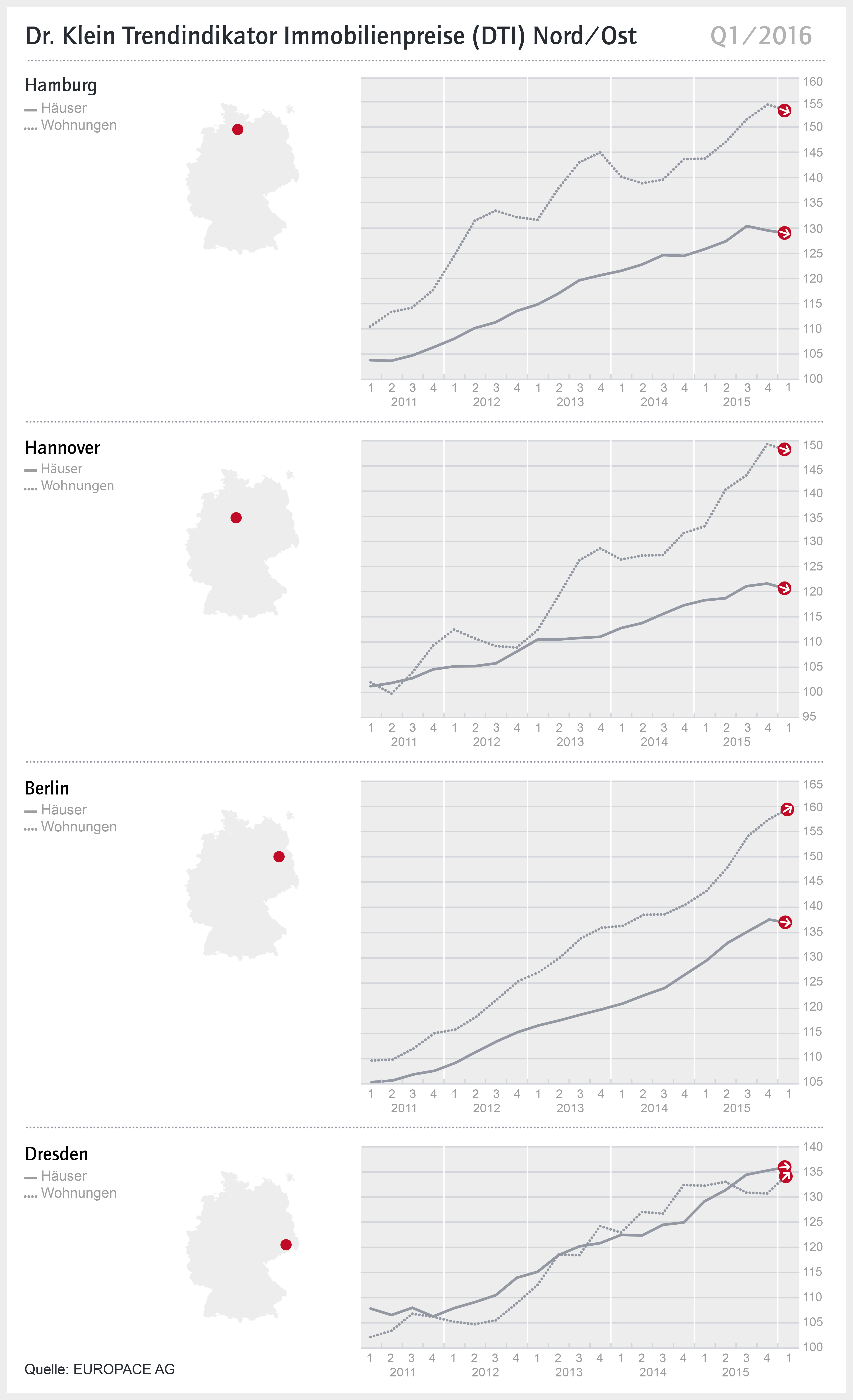 Der Dr. Klein Trendindikator hat die Preisentwicklung im ersten Quartal 2016 von Eigentumswohnungen sowie Ein- und Zweifamilienhäusern im Norden und Osten Deutschlands untersucht.