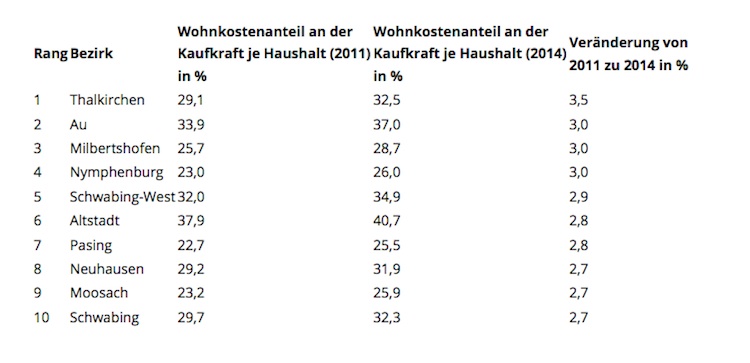 Am stärksten ist der Wohnkostenanteil zwischen 2011 und 2014 laut dem aktuellen EIMX in Thalkirchen gestiegen (plus 3,5 Prozent). In Milbertshofen und Nymphenburg beträgt die prozentuale Zunahme demnach glatte drei Prozent und in Pasing knapp drei Prozent. (st)