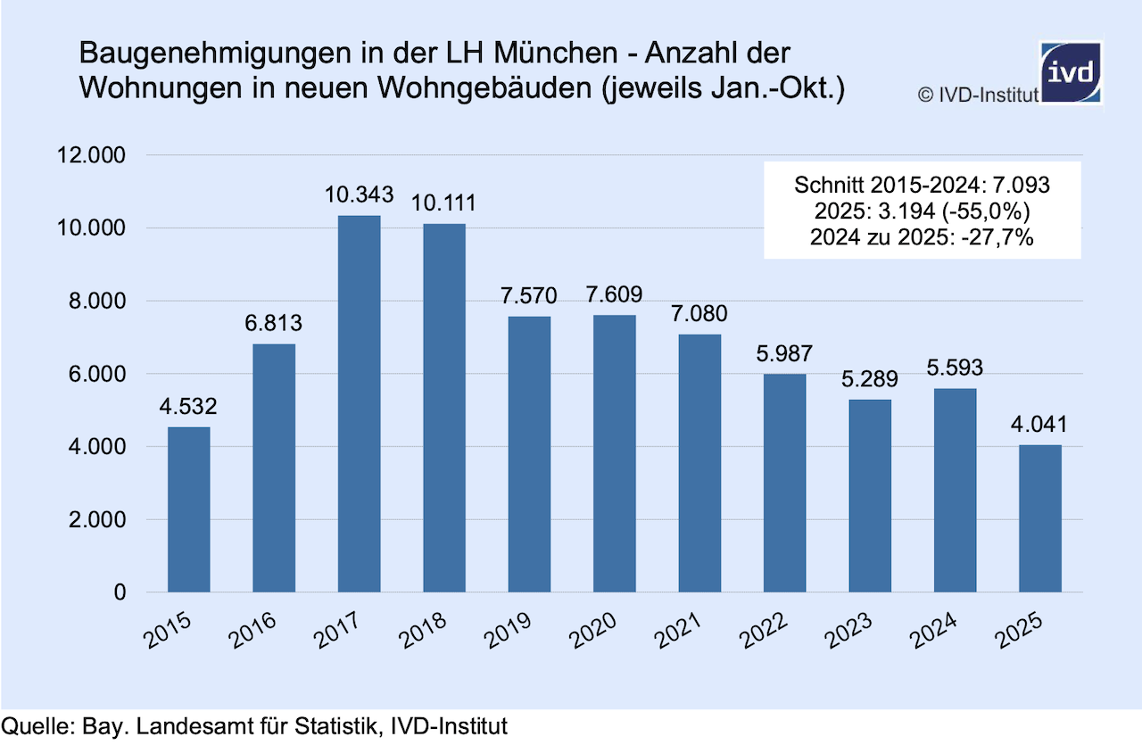 In der Landeshauptstadt München hat sich die Krise im Wohnungsneubau weiter verschärft. Zwischen Januar und Oktober 2025 wurden nach einer Auswertung des IVD Süd nur gut 4.000 neue Wohneinheiten genehmigt. Gegenüber dem bereits schwachen Vorjahreszeitraum entspricht dies einem Rückgang um 28 Prozent. Im Vergleich zum Zehn-Jahresmittel der Jahre 2015 bis 2024 liegt das Minus sogar bei 55 Prozent.