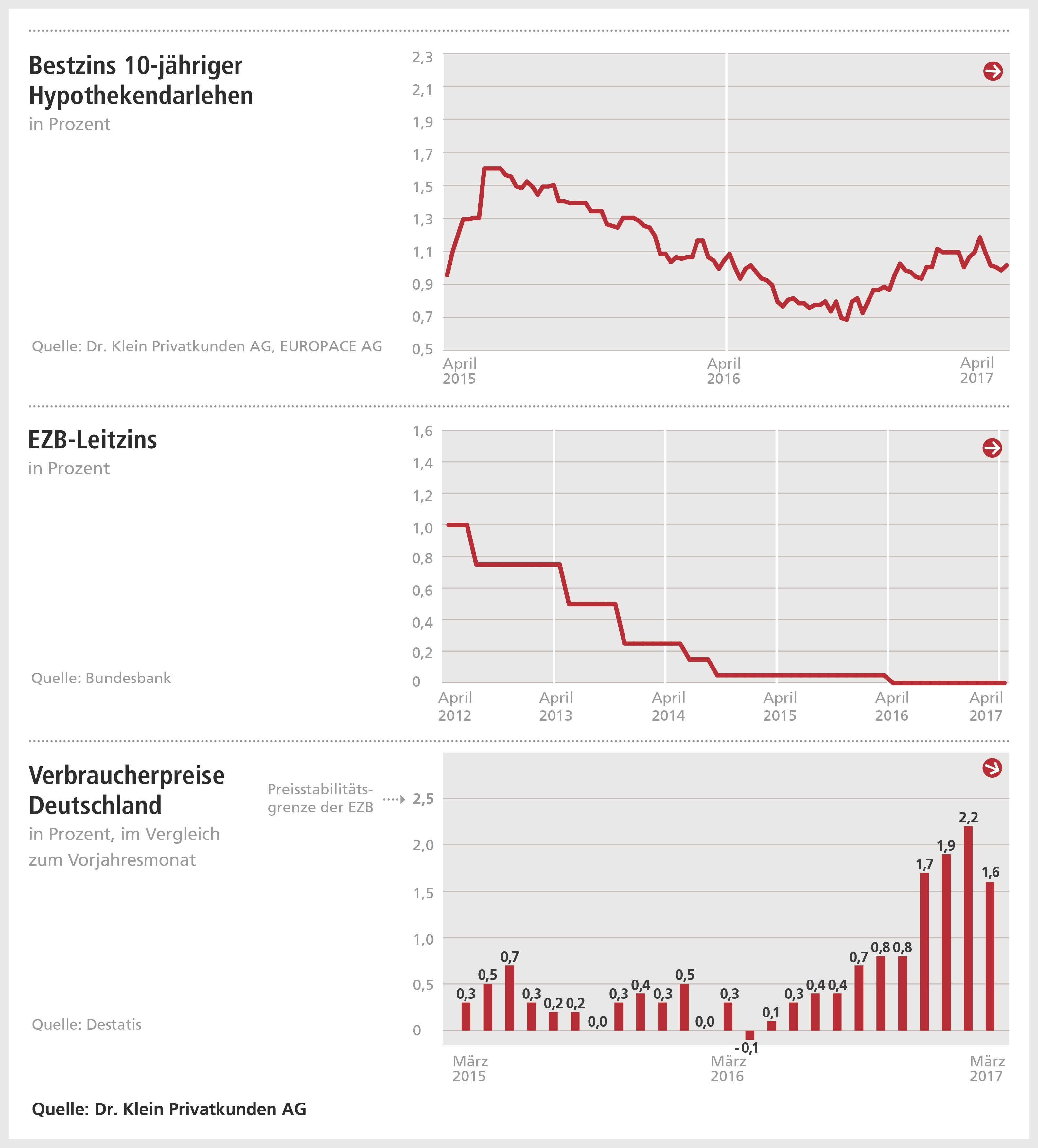Zudem lassen sich die Zinsen in Europa nicht in Gänze von denen in der USA entkoppeln und dort stehen 2017 weitere Zinsschritte an. Im vergangenen Monat bewegte sich der Bestzins für Immobiliendarlehen mit zehnjähriger Sollzinsbindung um den Ein-Prozent-Wert.
