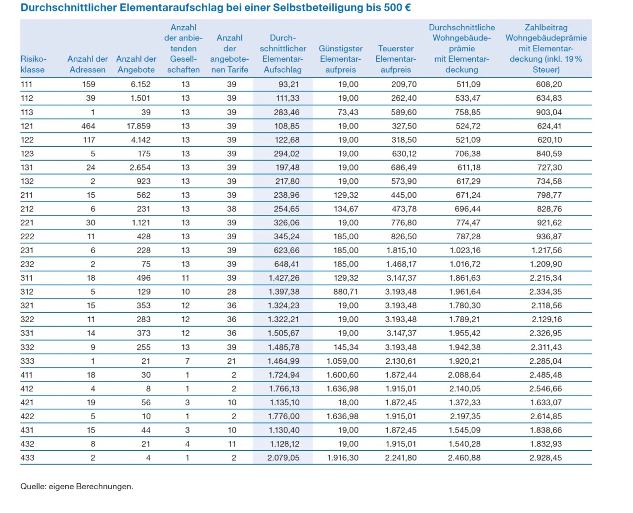 In absoluten Zahlen bedeutet das: Für ein durchschnittliches Einfamilienhaus können die Zusatzkosten in Hochrisikogebieten schnell über 1.000 Euro jährlich liegen – bei einem vergleichsweise niedrigen Selbstbehalt von 500 Euro. Wie die detaillierte Tabelle der Studie zeigt, reichen die Aufpreise je nach Risikoklasse und Tarif sogar bis über 3.000 Euro pro Jahr. Gleichzeitig liegt die Gesamtprämie inklusive Elementardeckung in diesen Regionen häufig bei mehr als 2.000 Euro jährlich.
