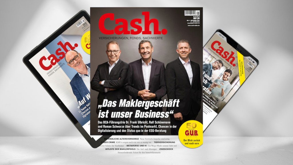 Die Cash.-Ausgabe 9/2023 ist erschienen. Titelinterview: Das Vorstands-Trio der BCA AG über die Trends im Poolmarkt, die Chancen der Digitalisierung, den Stand der Dinge in der ESG-Beratung und neue Produkte. Jetzt gedruckt oder kostenlos als E-Paper bestellen.